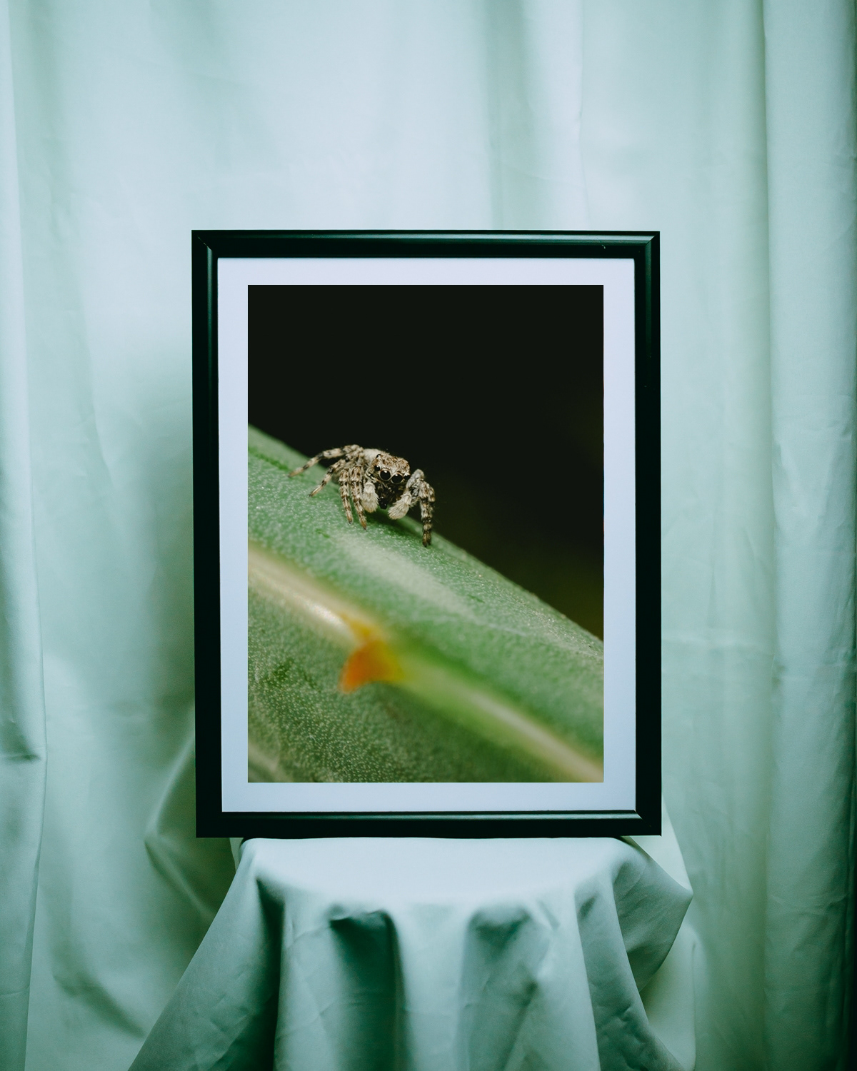 Fotografía en cuadro de una “Araña Saltarina” de la especie Salticidae sp. Esta araña fue retratada en su entorno natural.
