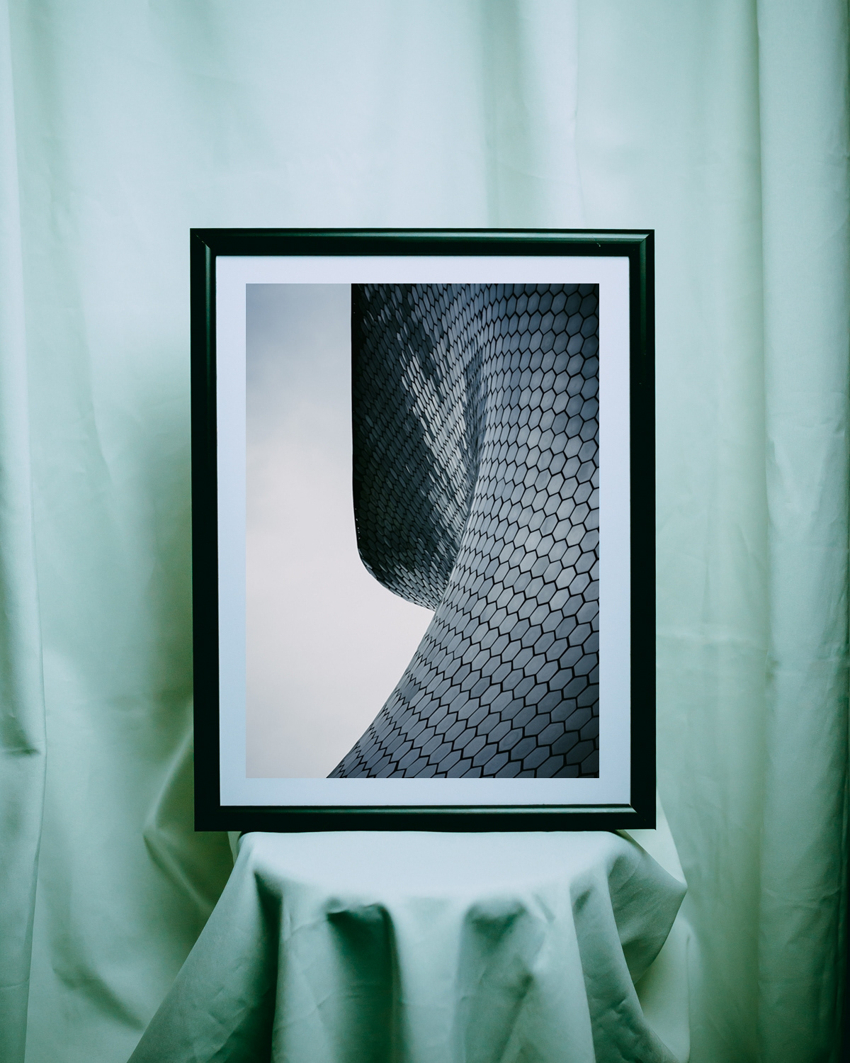 Fotografía en cuadro del Museo Soumaya de la Ciudad de México. El museo, diseñado por el arquitecto mexicano Fernando Romero, cuenta con más de 16,000 placas hexagonales realizadas en aluminio y se destaca como una obra de Arquitectura Contemporánea sobresaliente desde su apertura en 2011.